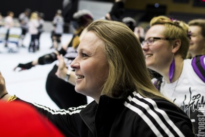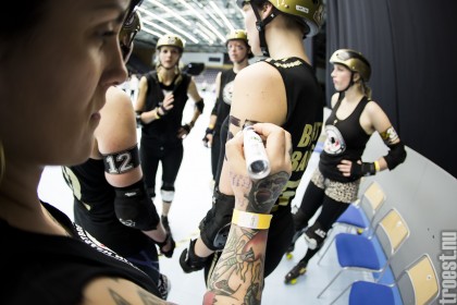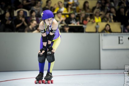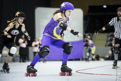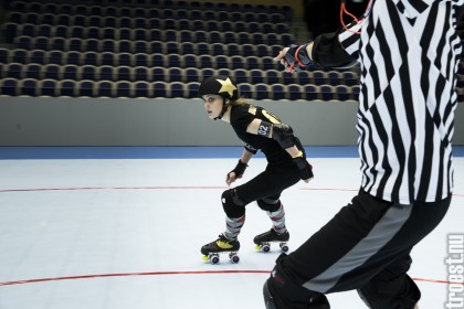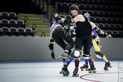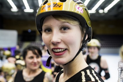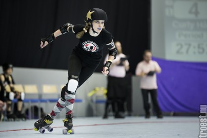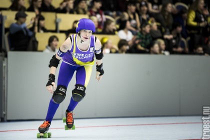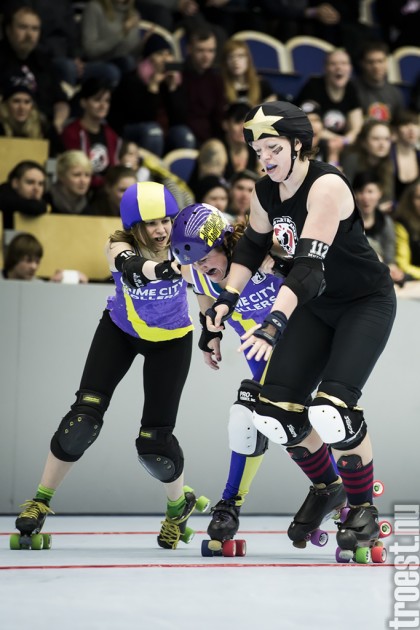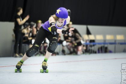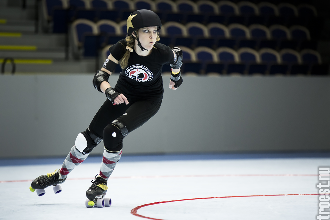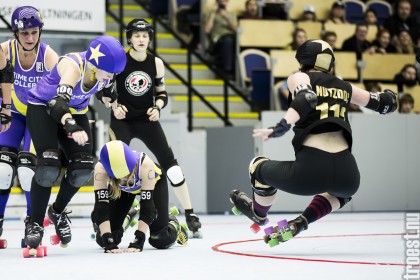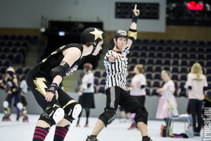 Copenhagen Roller Derbys Rollin Heartbreakers looked goood and flying against the iron hard ladies from Crime City Rollers. But not this time. Again it was played in Baltiska Hallen which make the photographs much brighter and makes it easier to capture the flying players – and I really got some nice winged ones this time.