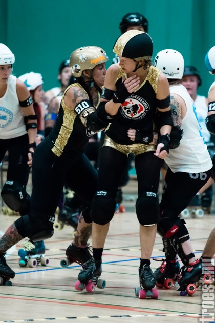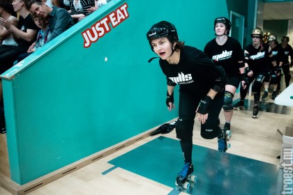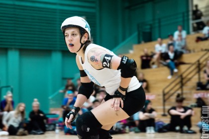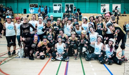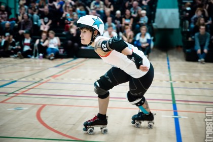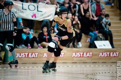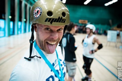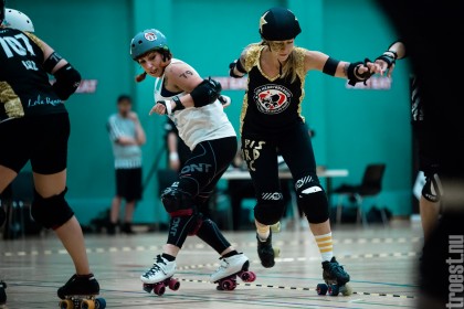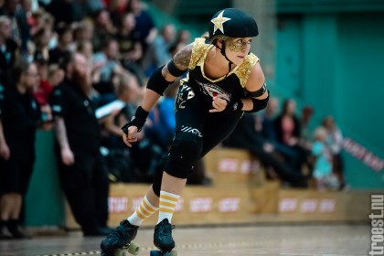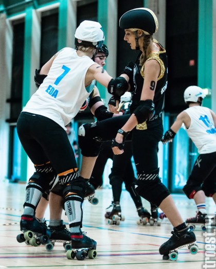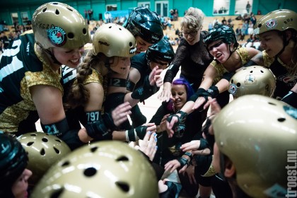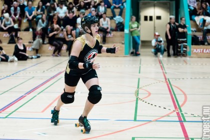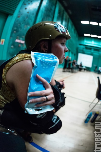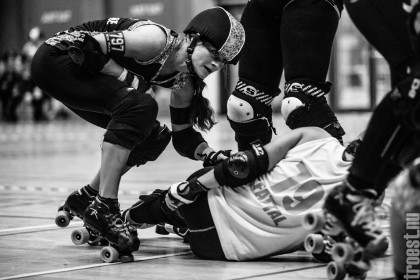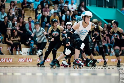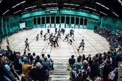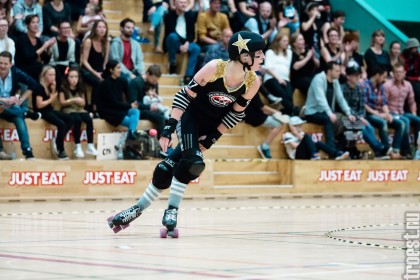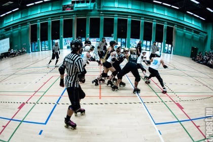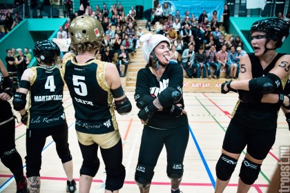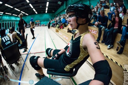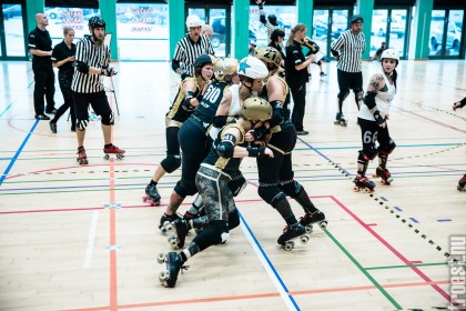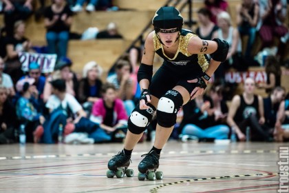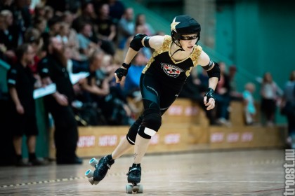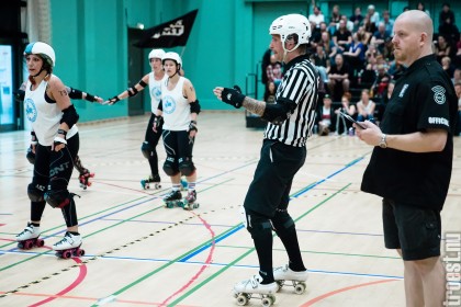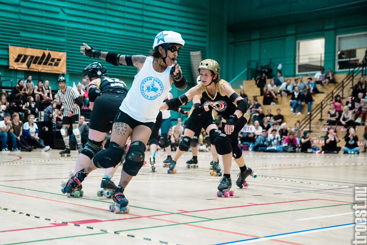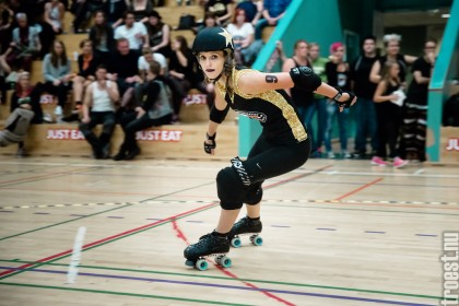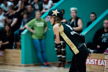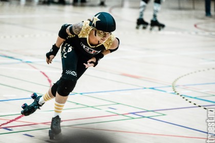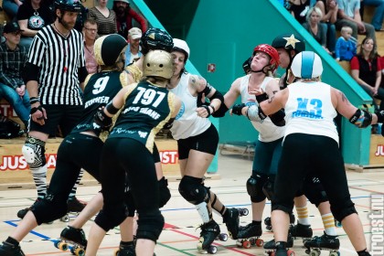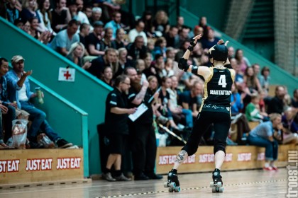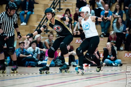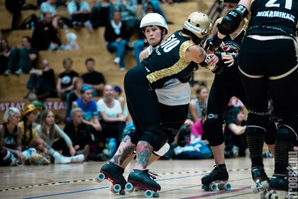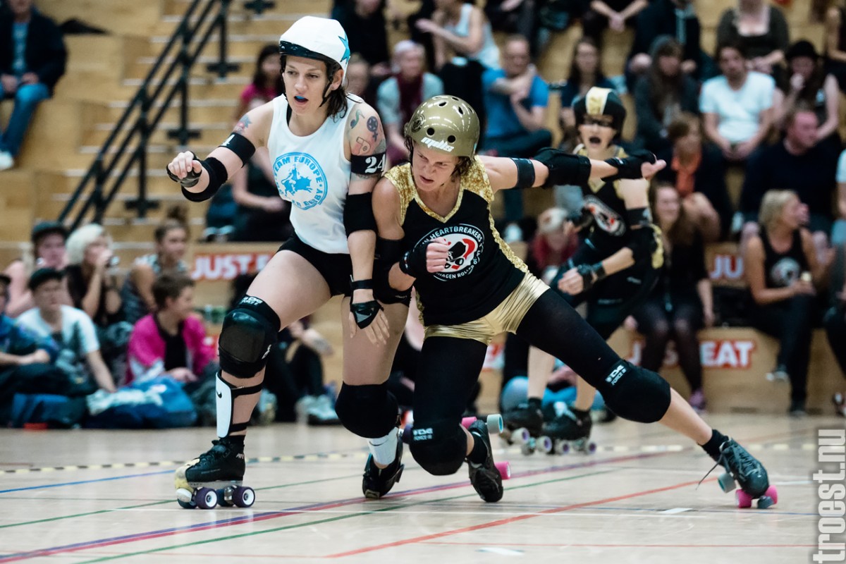 Copenhagen Roller Derbys Rollin’ Heartbreakers played against a selected team of great players from Europe brought together to DGI-byen in central Copenhagen. And it was a day to remember – a win to Copenhagen, new sponsors, new uniforms and a big tribute to injured player DuraKill Bunny.